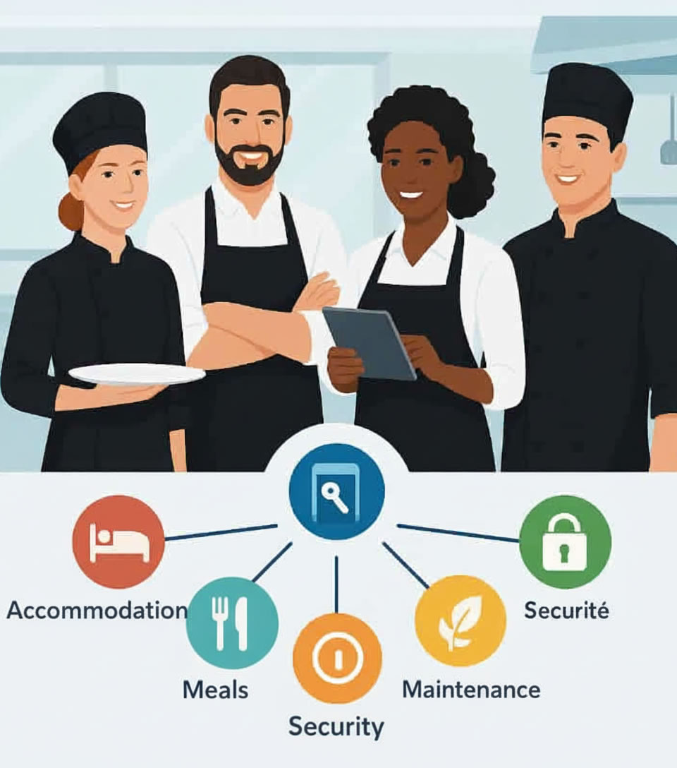 As a service provider, we offer turnkey solutions to ensure the well-being, comfort and user-friendliness of all residents and users of our services. To meet the specific needs of each of our clients, we offer a diverse and tailor-made range of services (catering, hospitality, facilities and utilities management), from consulting to camp design, including the supply of facilities and equipment. The Saphir Planner teams, driven by a passion for their work, strive every day to create safe and welcoming environments for both camp residents and corporate catering users. We are committed to sustainable development in Cameroon by recruiting and training our employees, forging partnerships with suppliers close to our sites and participating in local community initiatives.